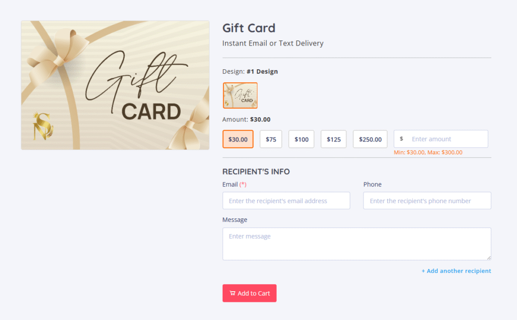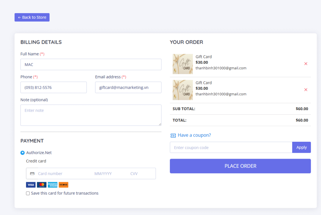 Dưới đây là trang mẫu mà bạn có thể thấy, để mua Gift Card thì cần nhập đầy đủ thông tin sau đó click “Add to Cart”