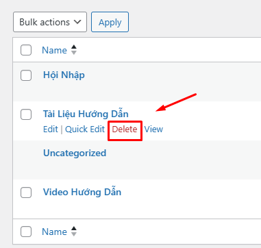 Bước 2: Rê chuột vào Categories cần xóa → Nhấn Delete