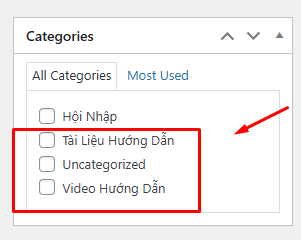 • Ở thanh bên phải, tìm mục Categories → Tick chọn chuyên mục phù hợp